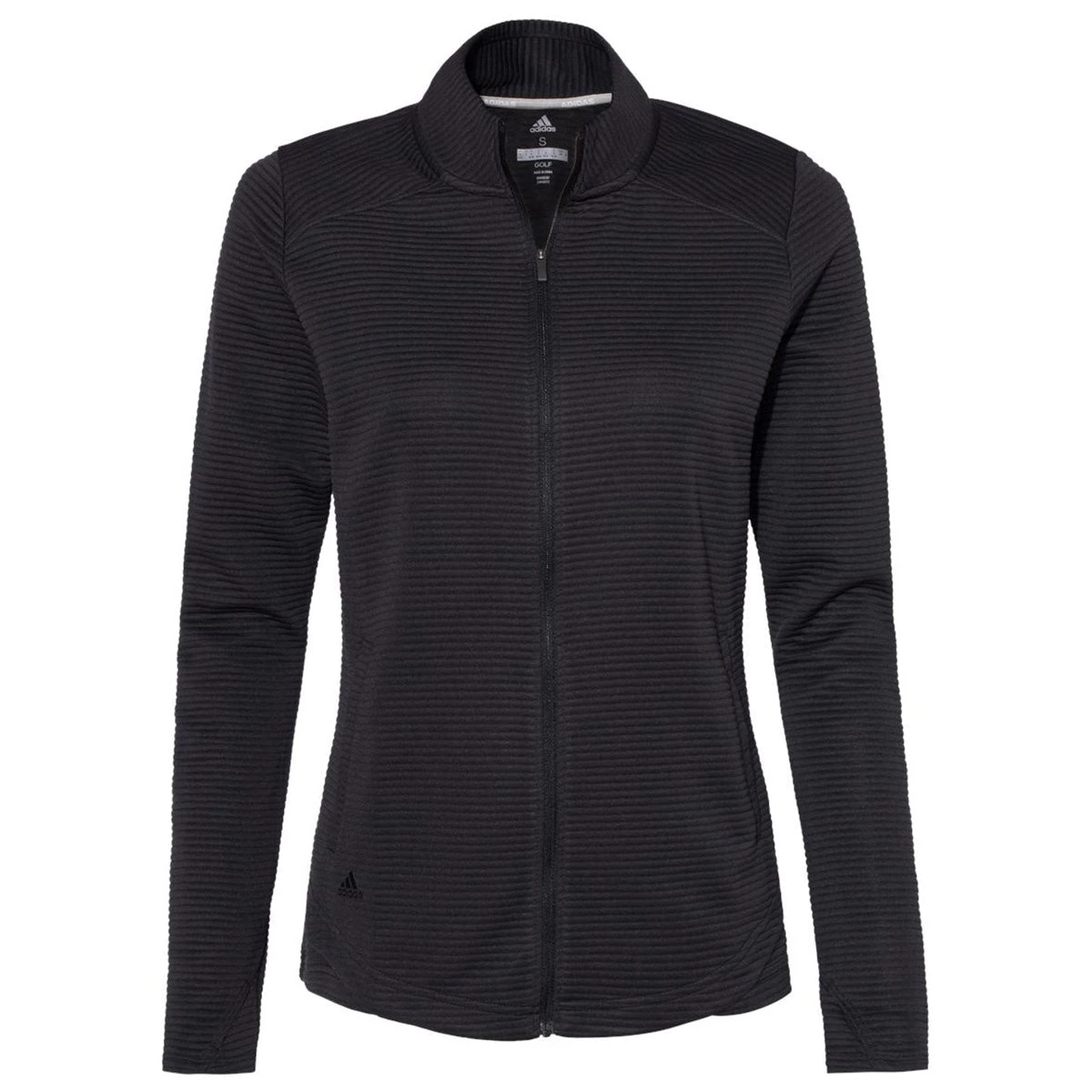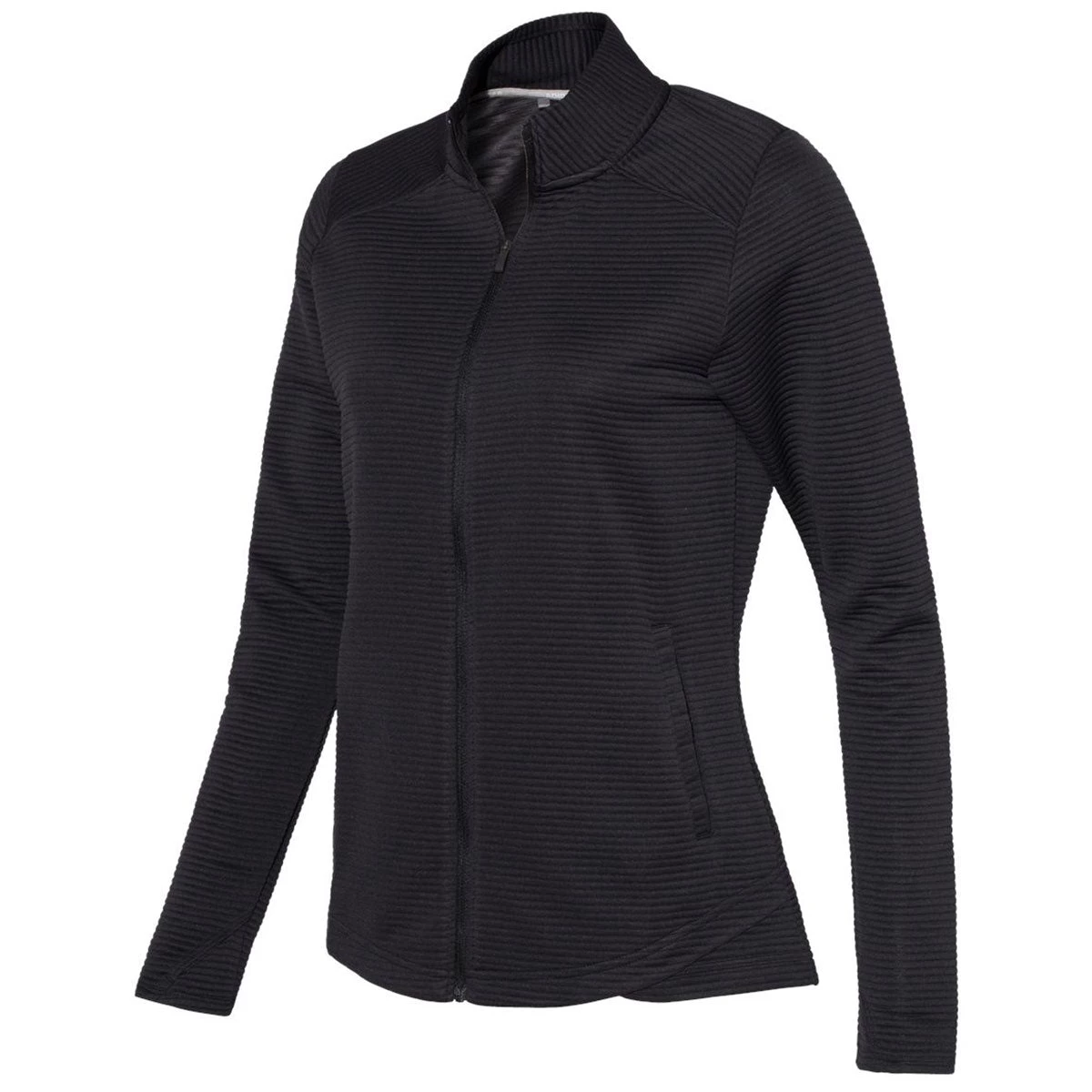 Have a bit of fashion fun in an embroidered Adidas Women’s Black Textured Full-Zip Jacket. Made of 100% recycled polyester spacer knit, this jacket is comfortable to wear and good for the environment. An all over texture adds a little something extra to the full front jacket with front pockets and thumbholes on the cuff. Add a company logo to these jackets to offer as employee gifts or a custom logo to create warm-up athleisure apparel for team or individual competitors. Offering protection from the wind with a mock neck and thumbholes to keep sleeves in place, this jacket is a true must-have.