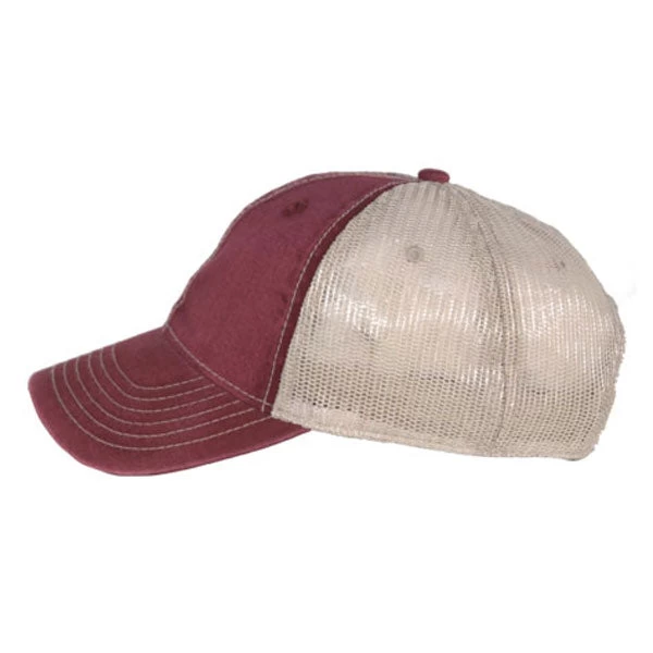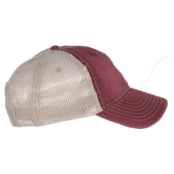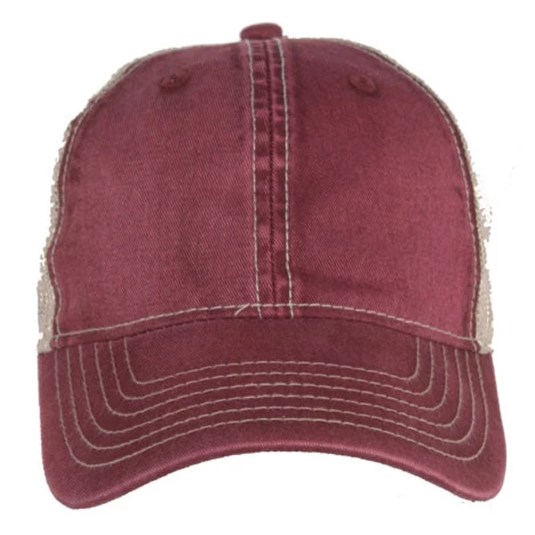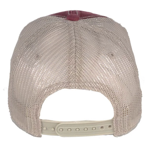 The AHEAD Maroon/Tan Tea Stained Mesh Back Cap with its unique look and your custom company logo can be a present that your employees will wear gladly wear. It is a classic cut cap with a large front ideal for branding. It is made of tea stained twill on the front and a new improved mesh on the back, which gives it this unique look. It is unstructured, so it is foldable and easily fits into a bag. Your employees can carry it around in their jacket and wear it when needed. On the back this cap has plastic snaps for size adjustment.