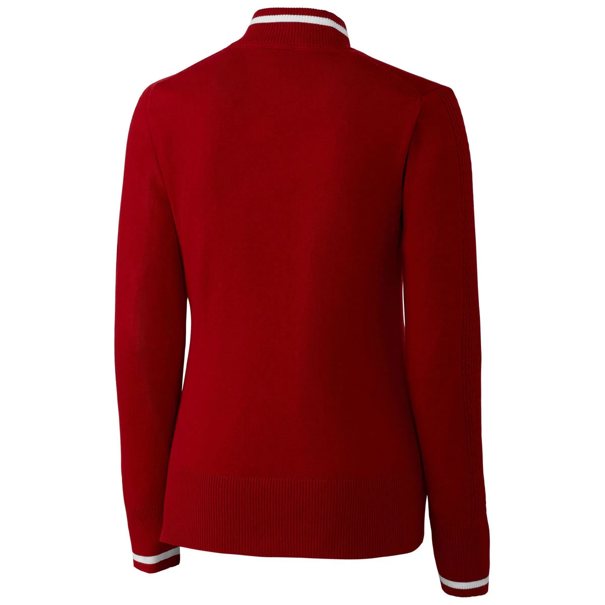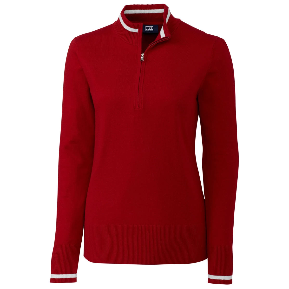 The solid design of this Cutter & Buck Women’s Cardinal Red Lakemont Tipped Half-Zip adds a classy look for a casual company event. The cotton and nylon body on this half-zip mock neck features a cable stitch sleeve with a small color accent on the cuffs. That same accent can be found along the collar. The contrast tipping along the collar adds a good fit onto the neck. Order this handsome customizable jacket for a golfing event or any special outdoor corporate occasion. The solid surface makes the perfect canvas for your company’s custom logo.