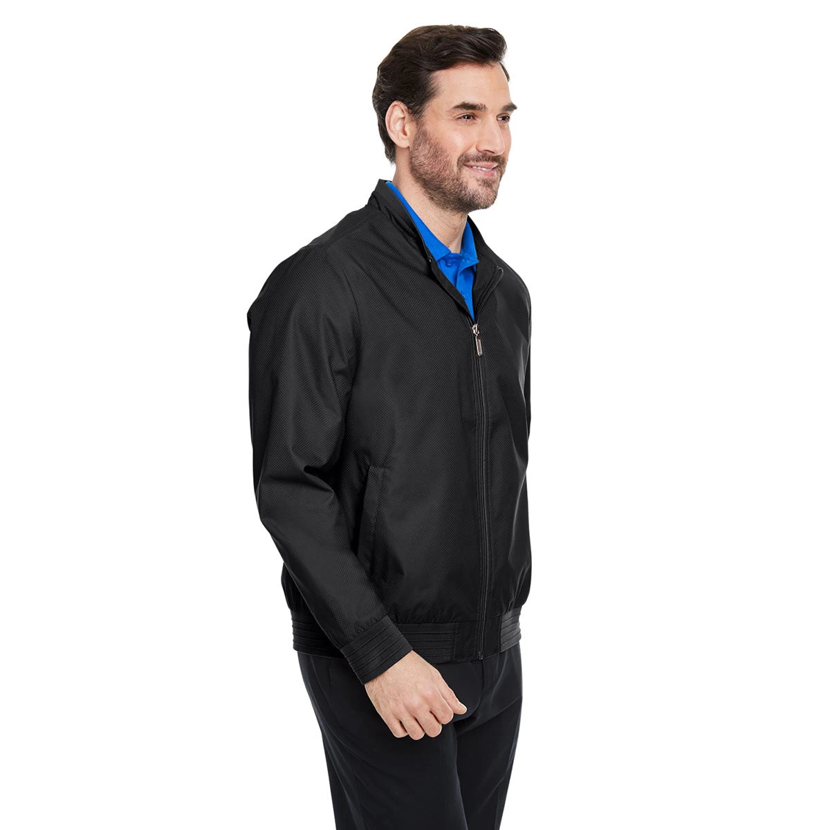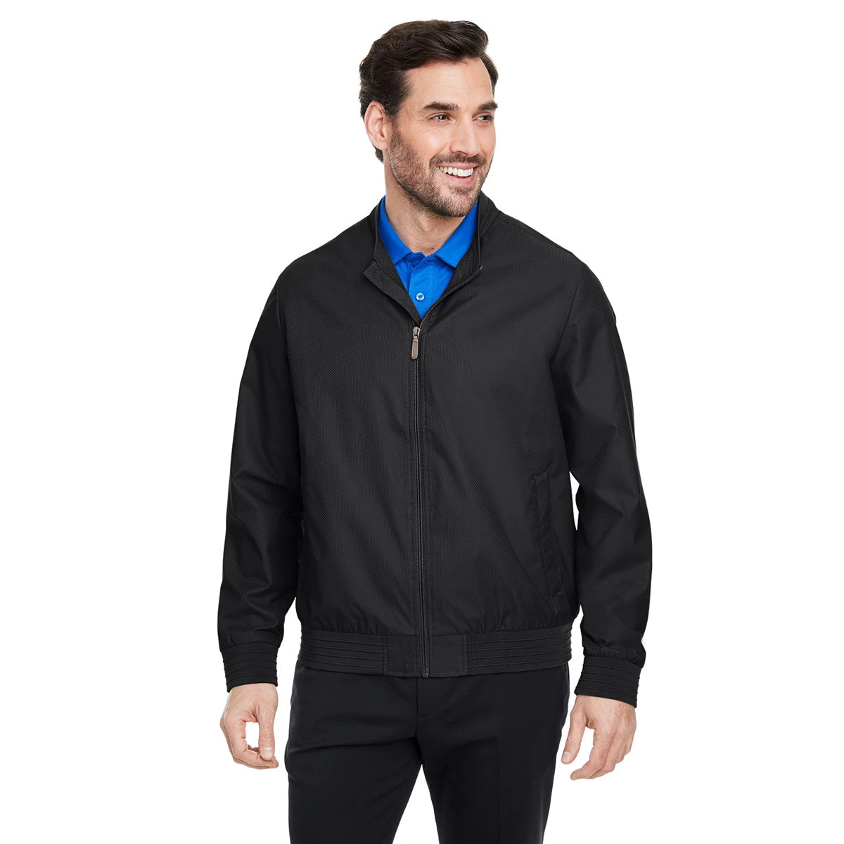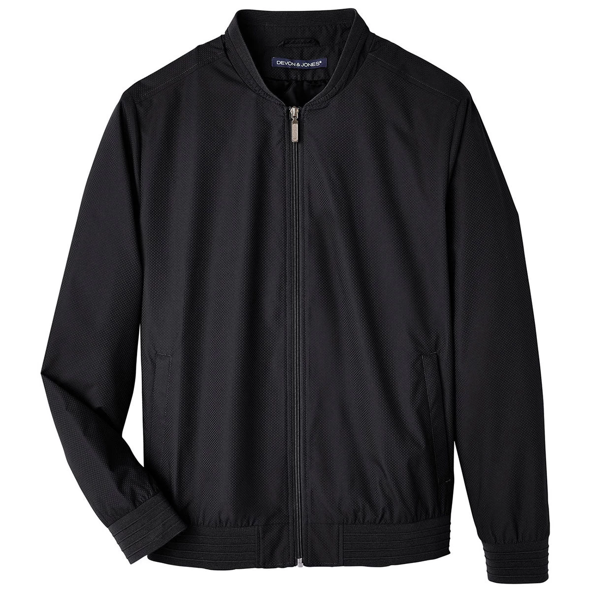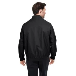 Choose a custom logo for the Devon & Jones Me Black Vision Club Jacket for an updated classic look that many will adore. The lightweight polyester dobby jacket has a polyester taffeta lining and is water resistant. The sleek, simple look is perfect as employee apparel that can be worn over a tank. tee, or long sleeve shirt with your company logo to make workers easy to recognize. A center front zipper makes this jacket easy to take on and off as needed throughout the day.
