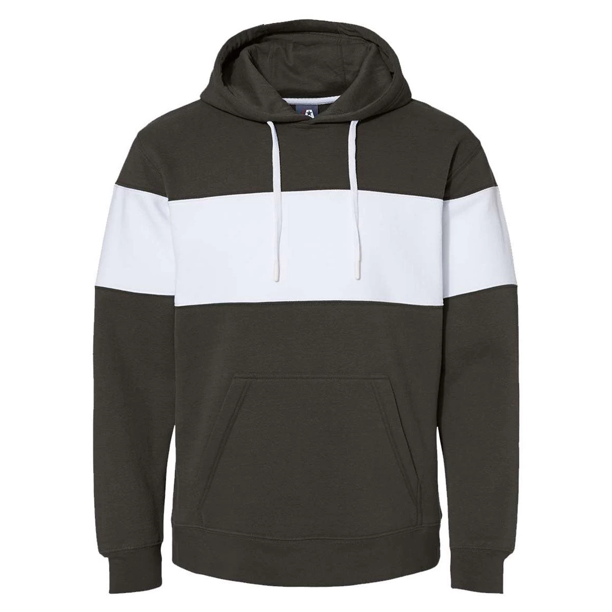 Stand out with embroidery on the J. America Men’s Black Varsity Fleece Colorblocked Hooded Sweatshirt. Choose a custom logo to create team or warm-up gear that will get noticed with a solid bottom, top and shoulders and large colorblocked stripe across the chest. A drawstring hood with contrasting drawstring protects from the wind when needed on this easy to layer hooded sweatshirt that nearly anyone can enjoy. Ideal as an employee gift with a company logo or a custom gift for friends, this sweatshirt makes those long days at home, outdoors, or running errand much more comfortable.