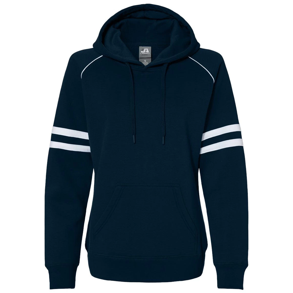 Design a custom logo for the J. America Women’s Navy Varsity Fleece Piped Hooded Sweatshirt for a creative look that can serve as employee apparel or a creative custom gift that most will adore. The straightforward sweatshirt design has a feminine fit with an attached drawstring hood that is jersey lined and double stripes around each sleeve. A set-in pouch pocket is perfect for small items as you work, relax, or enjoy a quick run in the park. Easy to layer, this hooded sweatshirt is great for camping, tailgating, and much more.