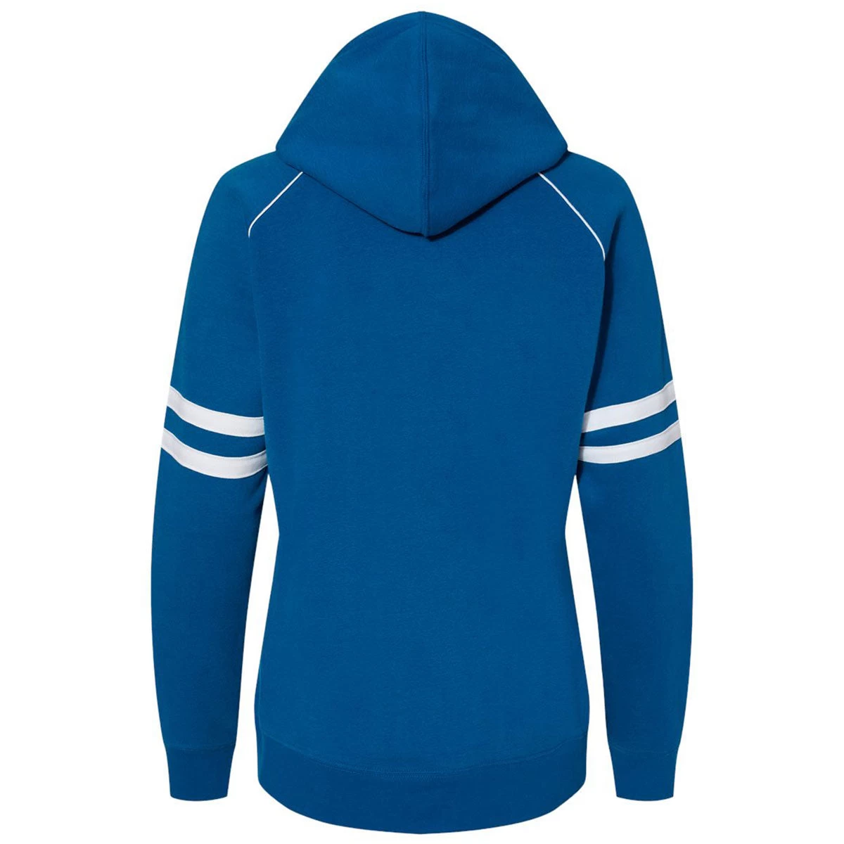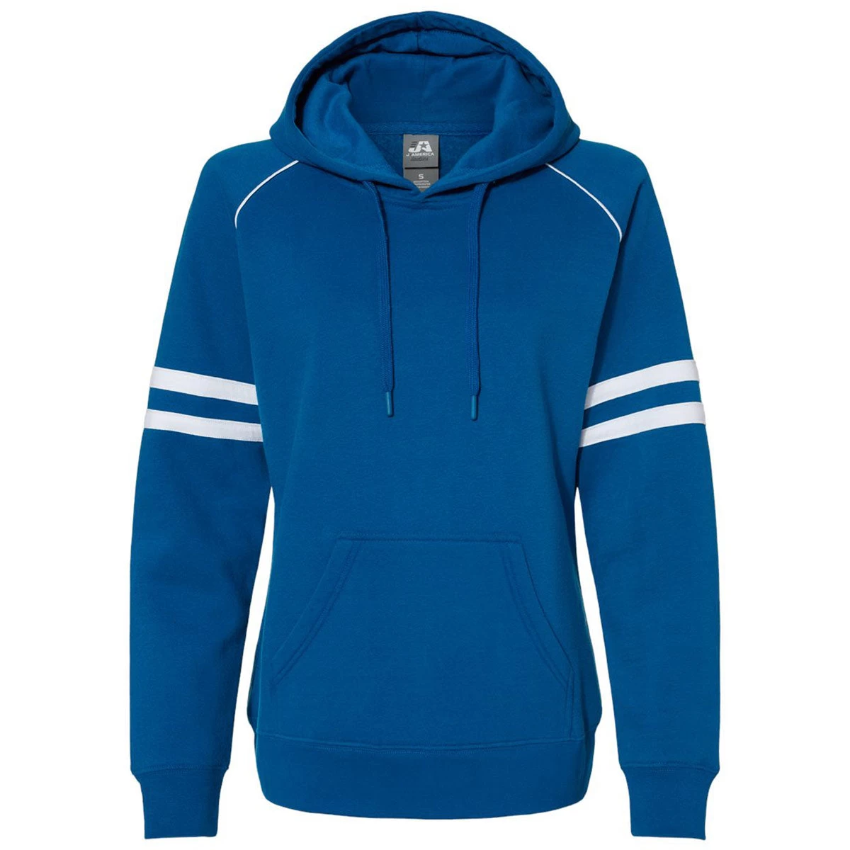 Design a custom logo for the J. America Women’s Royal Varsity Fleece Piped Hooded Sweatshirt for a creative look that can serve as employee apparel or a creative custom gift that most will adore. The straightforward sweatshirt design has a feminine fit with an attached drawstring hood that is jersey lined and double stripes around each sleeve. A set-in pouch pocket is perfect for small items as you work, relax, or enjoy a quick run in the park. Easy to layer, this hooded sweatshirt is great for camping, tailgating, and much more.