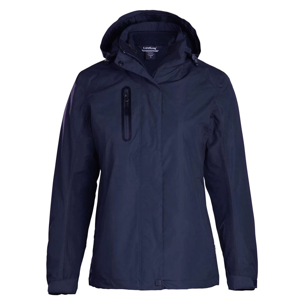 Discover your fashionable path by ordering the embroidered Landway Women’s Navy Pathfinder 3-in-1 Parka. Designed with a full front storm flap and closure, the ultimate winter coat repels water to ensure you remain comfortably dry throughout a cold weather weekend camping trip. Polyester microfleece lining acts as an extra layer of insulation that traps body heat. Attach and zip up the three-panel hood to protect your head and neck from icy winter blasts. Adjustable cuffs prevent cold air from moving up the arms. Add a custom logo to turn the warm parka into a powerful marketing platform.