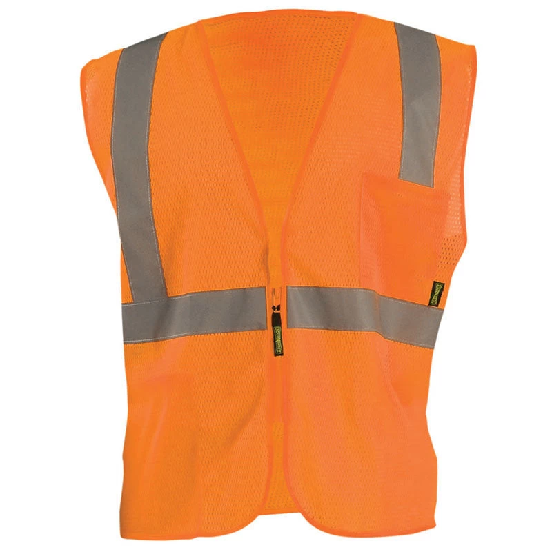 Stay as safe as possible in a custom OccuNomix Men’s Orange Mesh Self-Extinguishing Vest with Quick Release Zipper. Perfect as employee apparel for those who need safety and protection on the job, these bright yellow or orange vests are made of polyester mesh that has been treated to self-extinguish. The 2-inch flame resistant reflective tape makes sure you will be seen in nearly any condition while the quick release zipper means the vest is easy to remove if a problem occurs. Both a chest and lower pocket make it easy to carry necessary items.