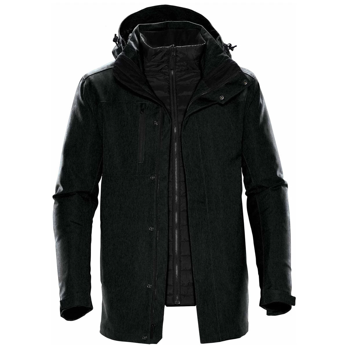 The Stormtech Men’s Black Avalanche System Jacket is the cold weather corporate gift or uniform solution you have been looking for. Perfect for employee apparel, this jacket has room on both layers for custom corporate logo embroidery, ensuring that your brand is represented even when the winter sets in. With an extreme cold rating down the -4 Degree F, H2XTREME breathable waterproofing technology and fully sealed seams, your team will feel protected no matter the weather. Built for lasting comfort, the inner shell zips out to be worn independently on days when heavy jackets are not needed, and the articulated joints ensure that neither layer wears out.